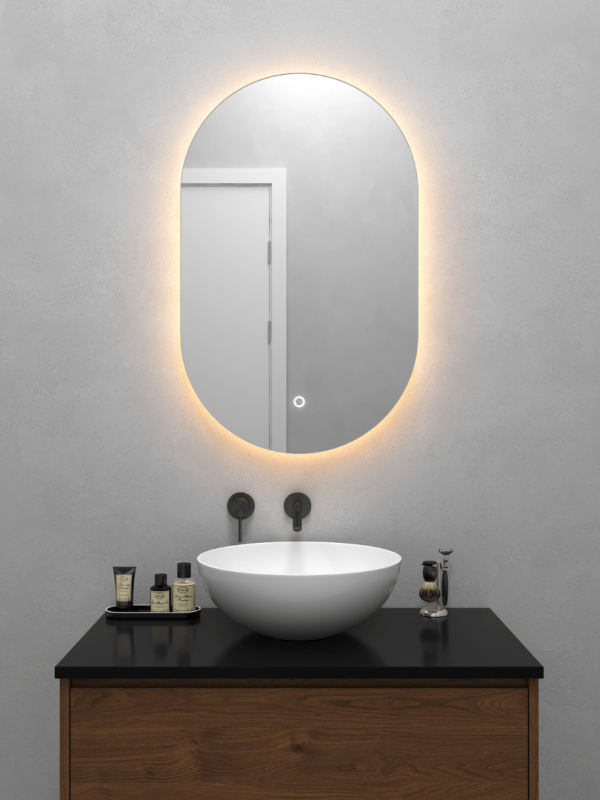 Безрамное зеркало овальной (капсульной) формы с контурной (тыльной) тёплой подсветкой, свет 3000К.